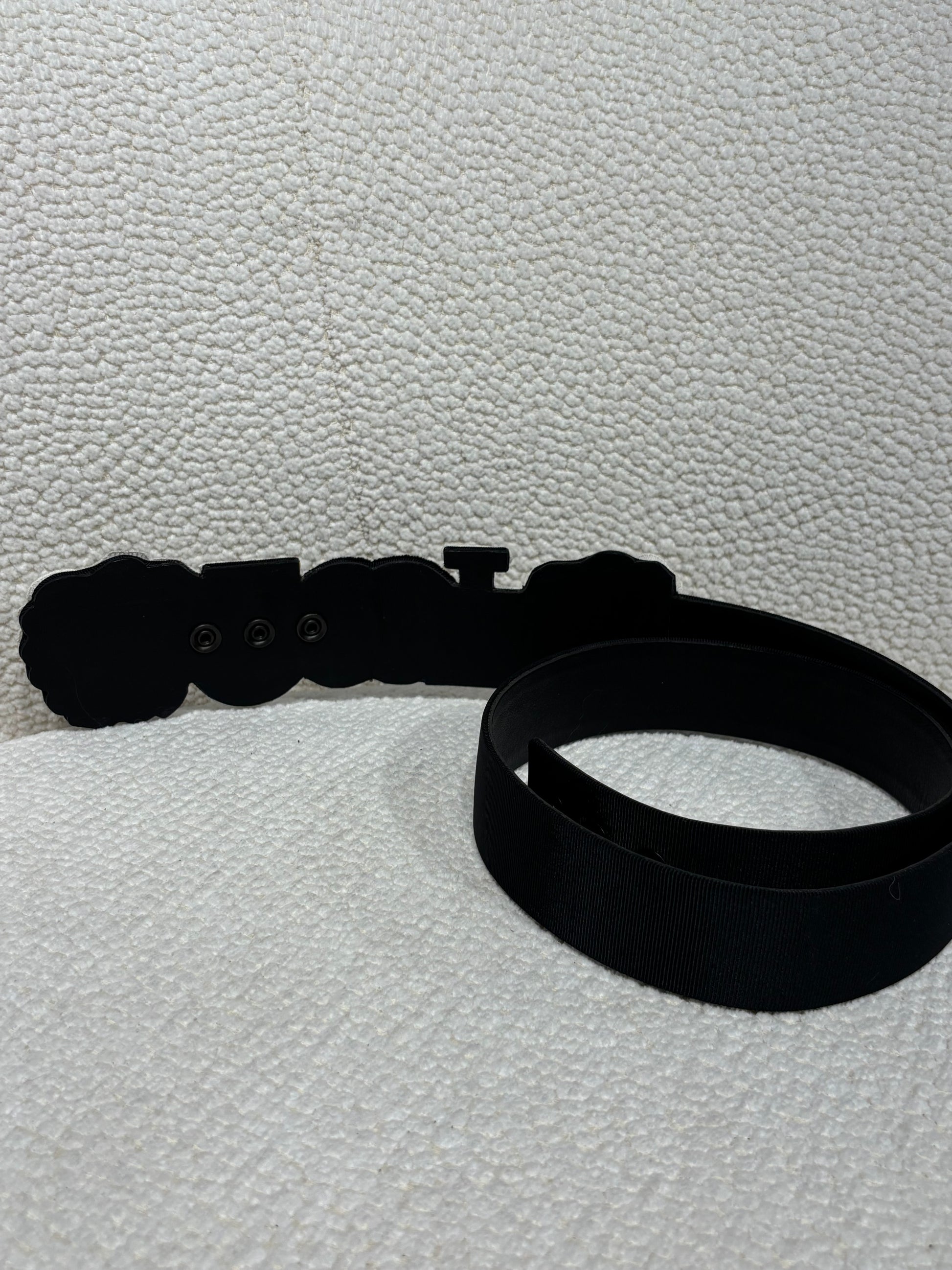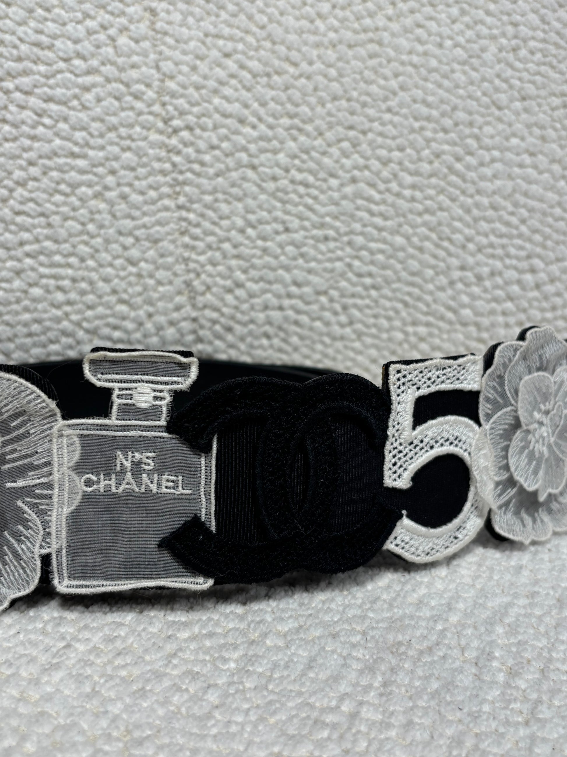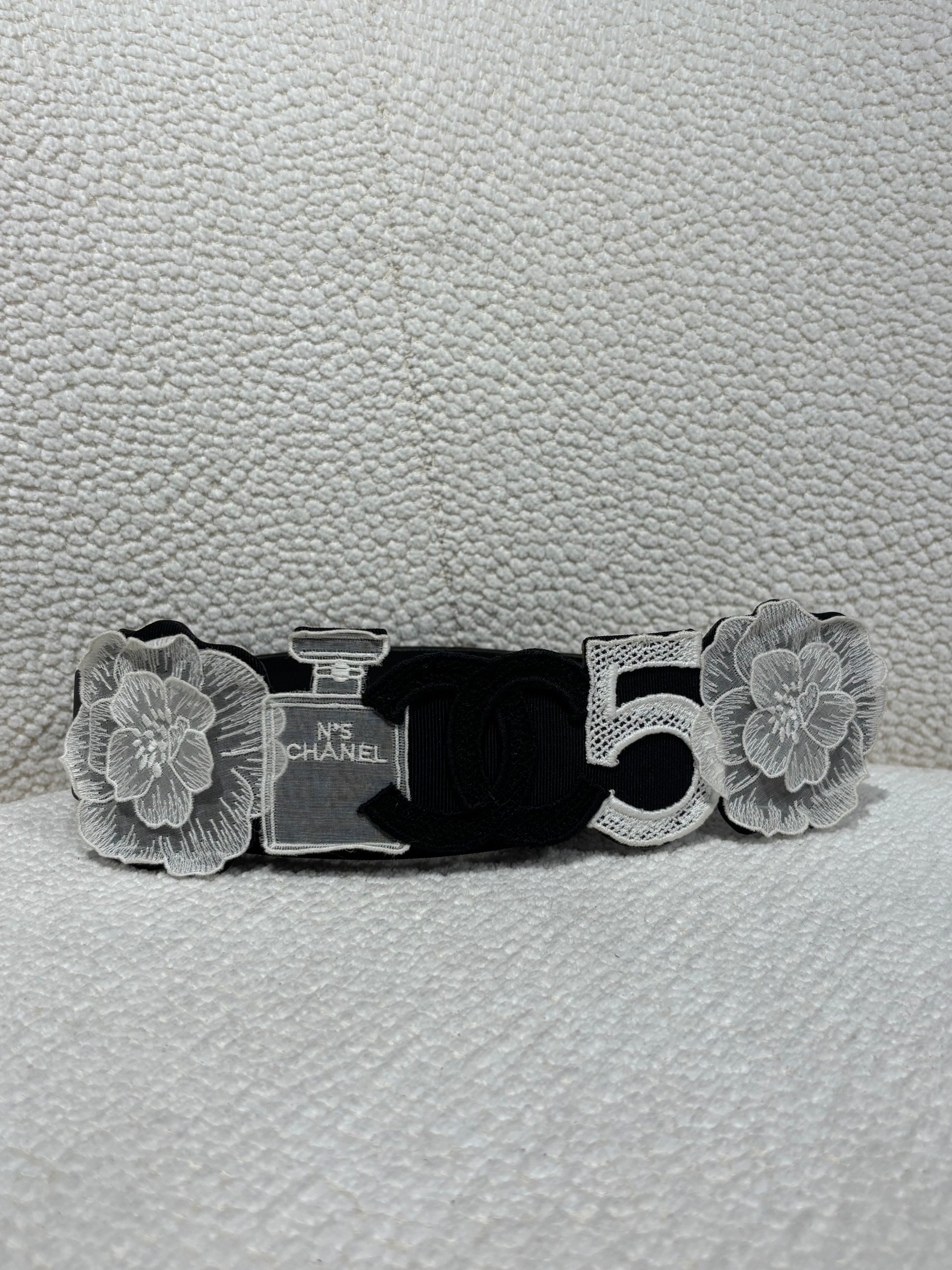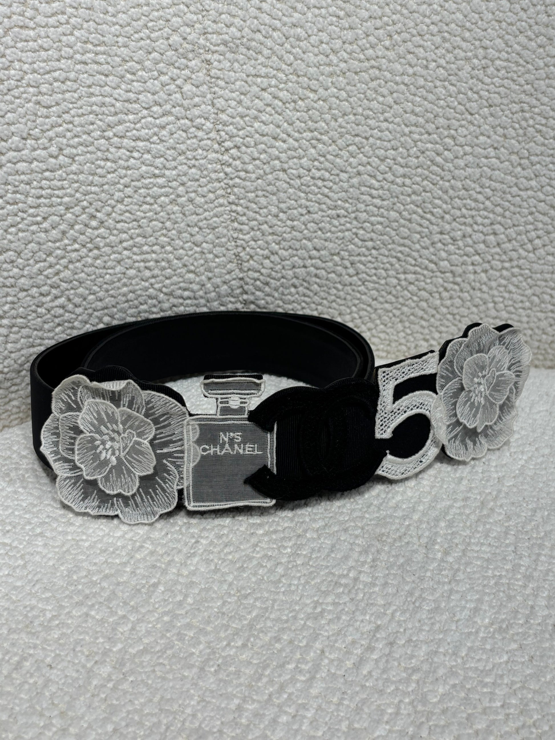 An exceptional Chanel belt in black canvas, decorated on the front with five iconic Chanel symbols: a white camellia, a white Chanel No. 5 perfume bottle, a black CC logo in the center, a white number 5, and another white camellia. A true celebration of the House’s most legendary codes.