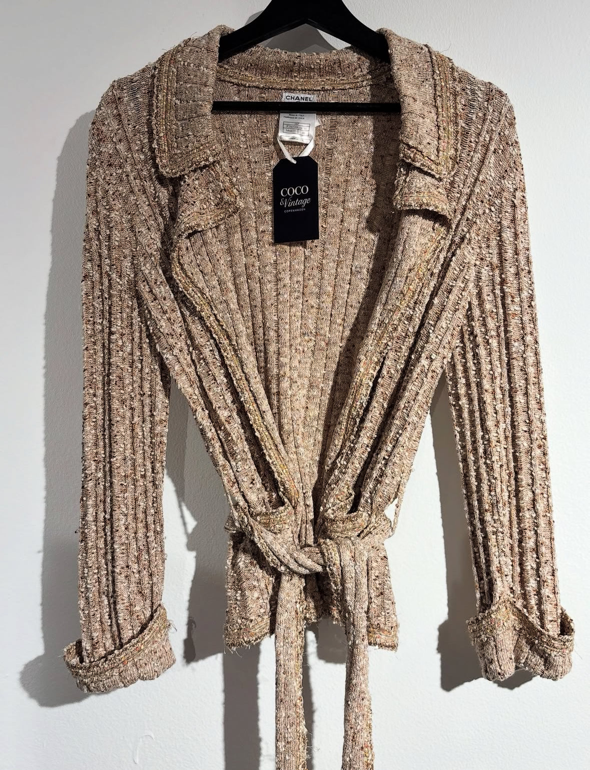 A beautiful Chanel cardigan in a stunning knit, featuring a mix of golden, terracotta, and apricot tones with subtle sparkle. The cardigan has a delicate sequin belt, and the iconic CC logo in sparkling stones is elegantly placed on one pocket.
