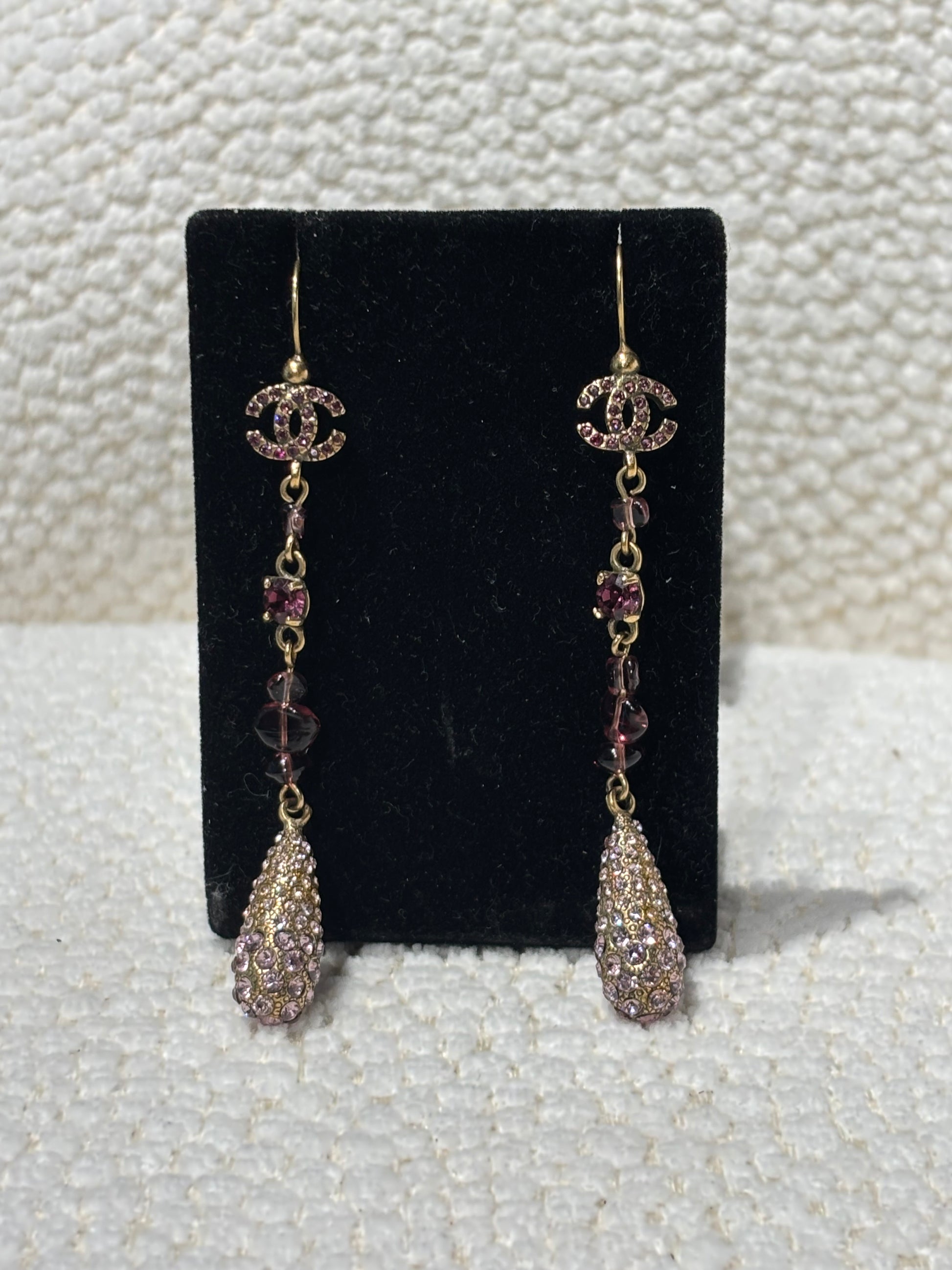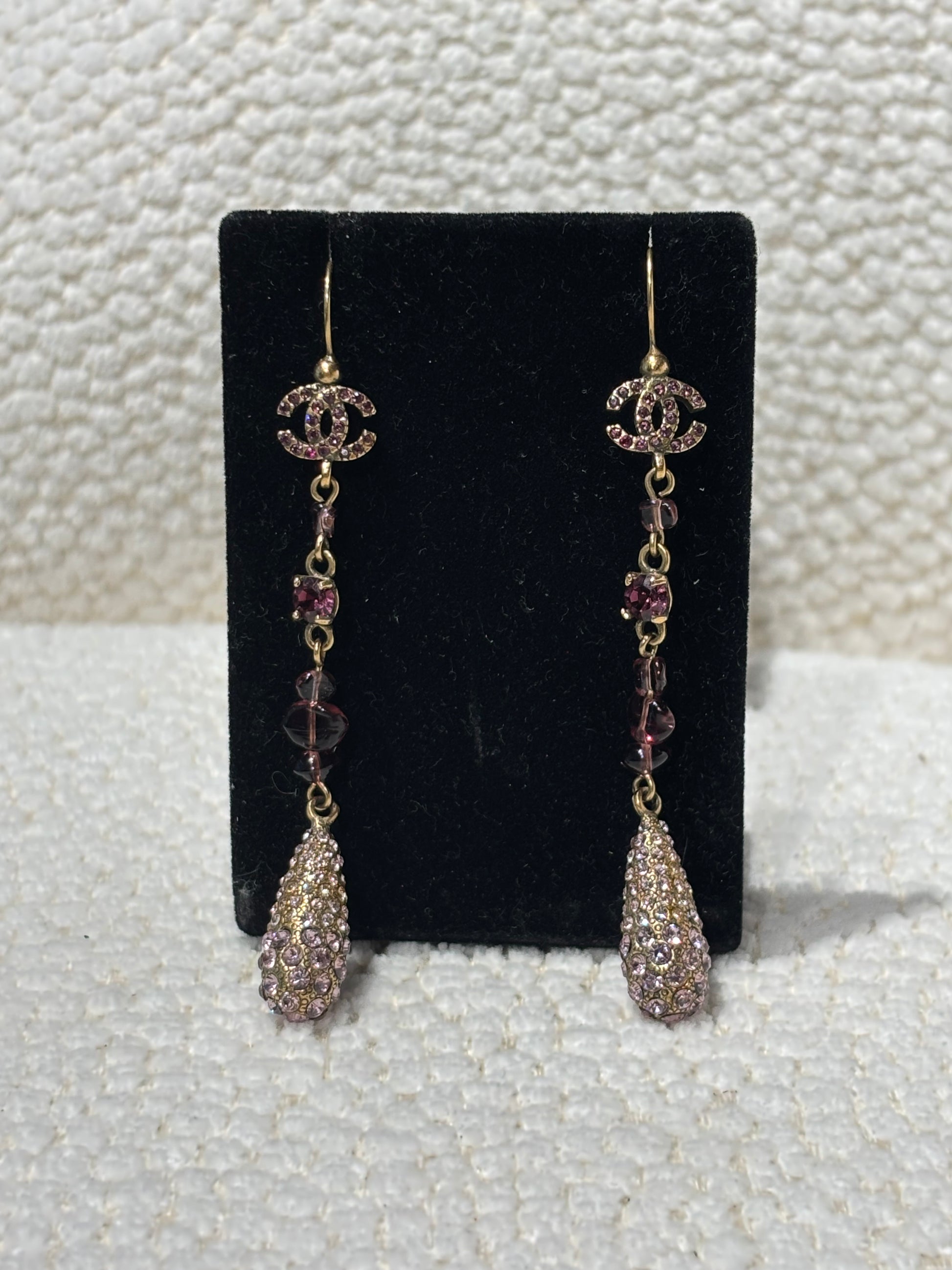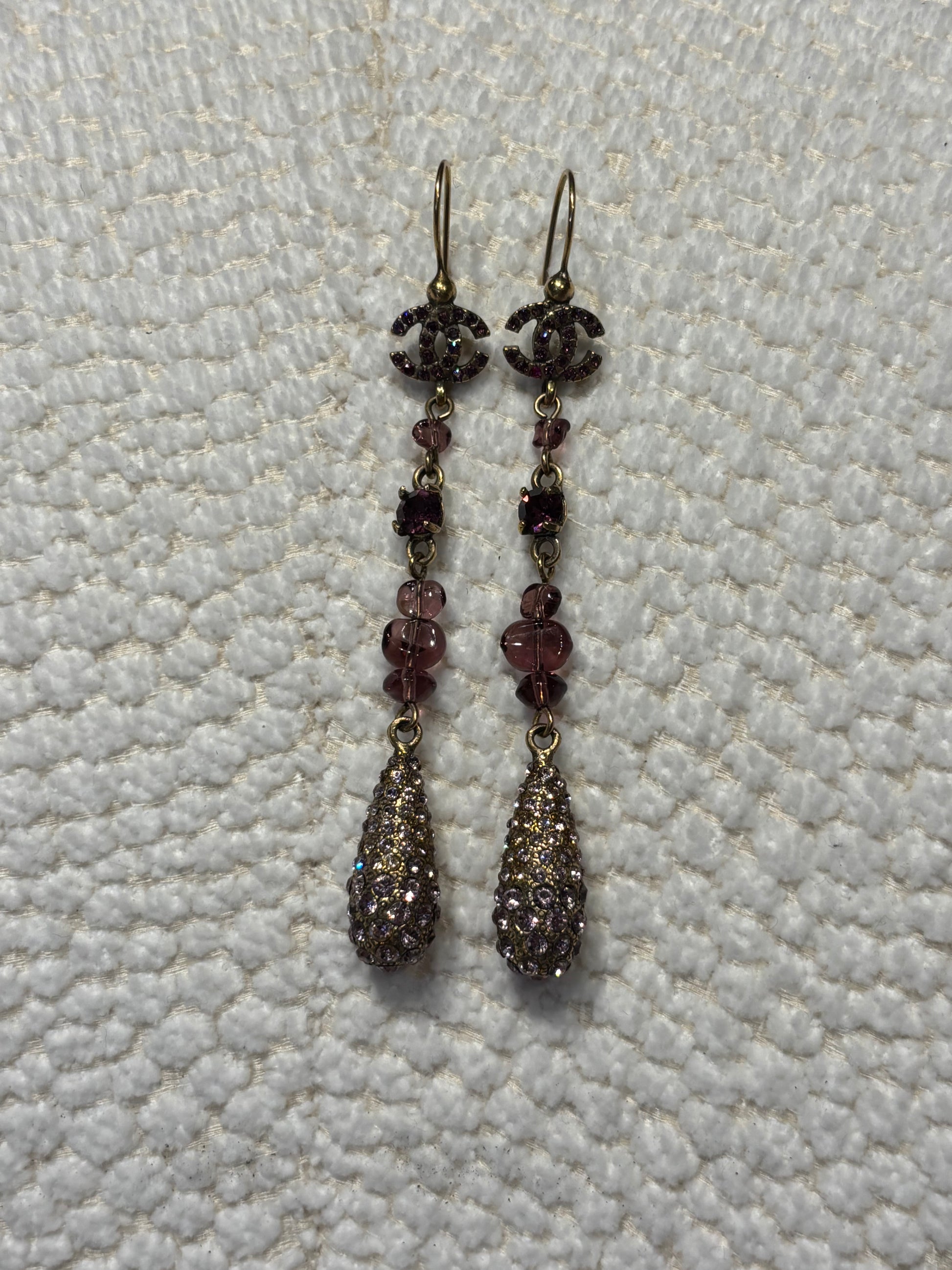 Absolutely stunning Chanel long earrings in gold-tone metal with gorgeous purple tones, featuring a delicate stone-set drop at the bottom. Rare, elegant, and perfect for any occasion — a truly exceptional gift and perfect if you love a unique piece or already have the classics.