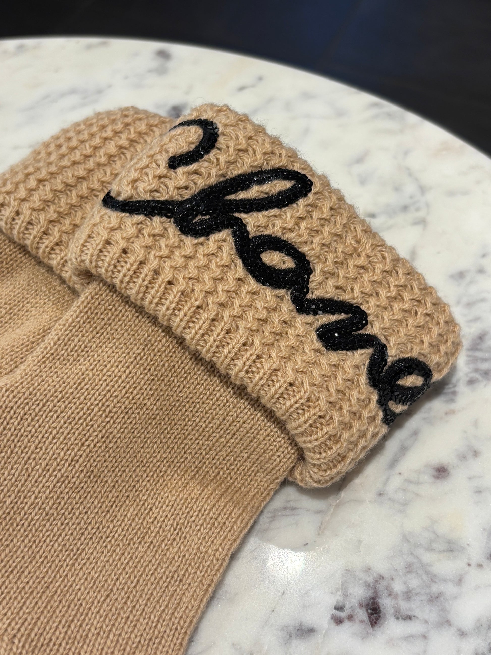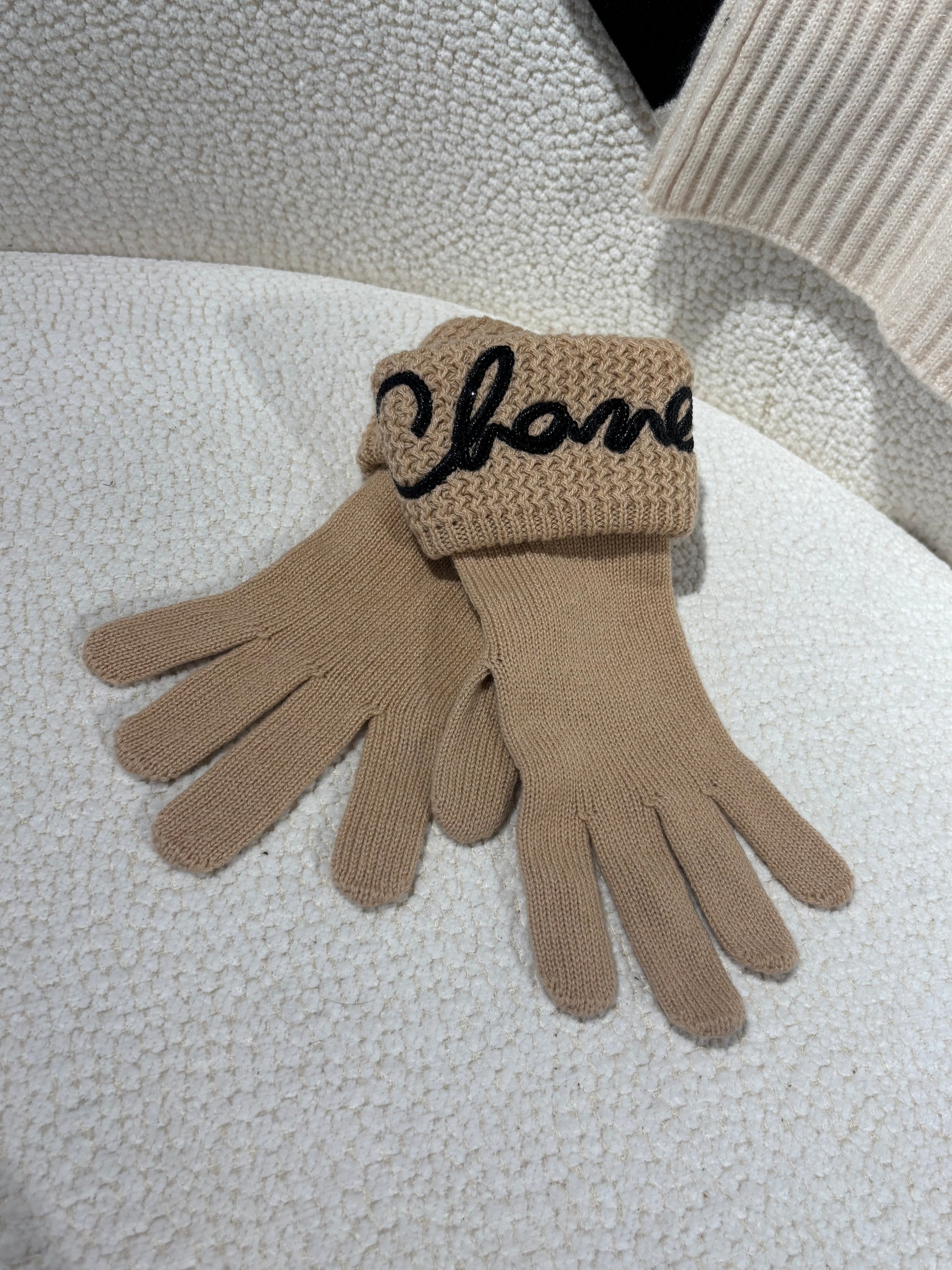 Elegant Chanel gloves crafted from 100% soft cashmere in a beautiful beige shade. One glove features the word Chanel written diagonally in black sequins, adding a subtle yet distinctive touch of luxury. Warm, lightweight, and timeless – perfect for both everyday wear and special occasions.