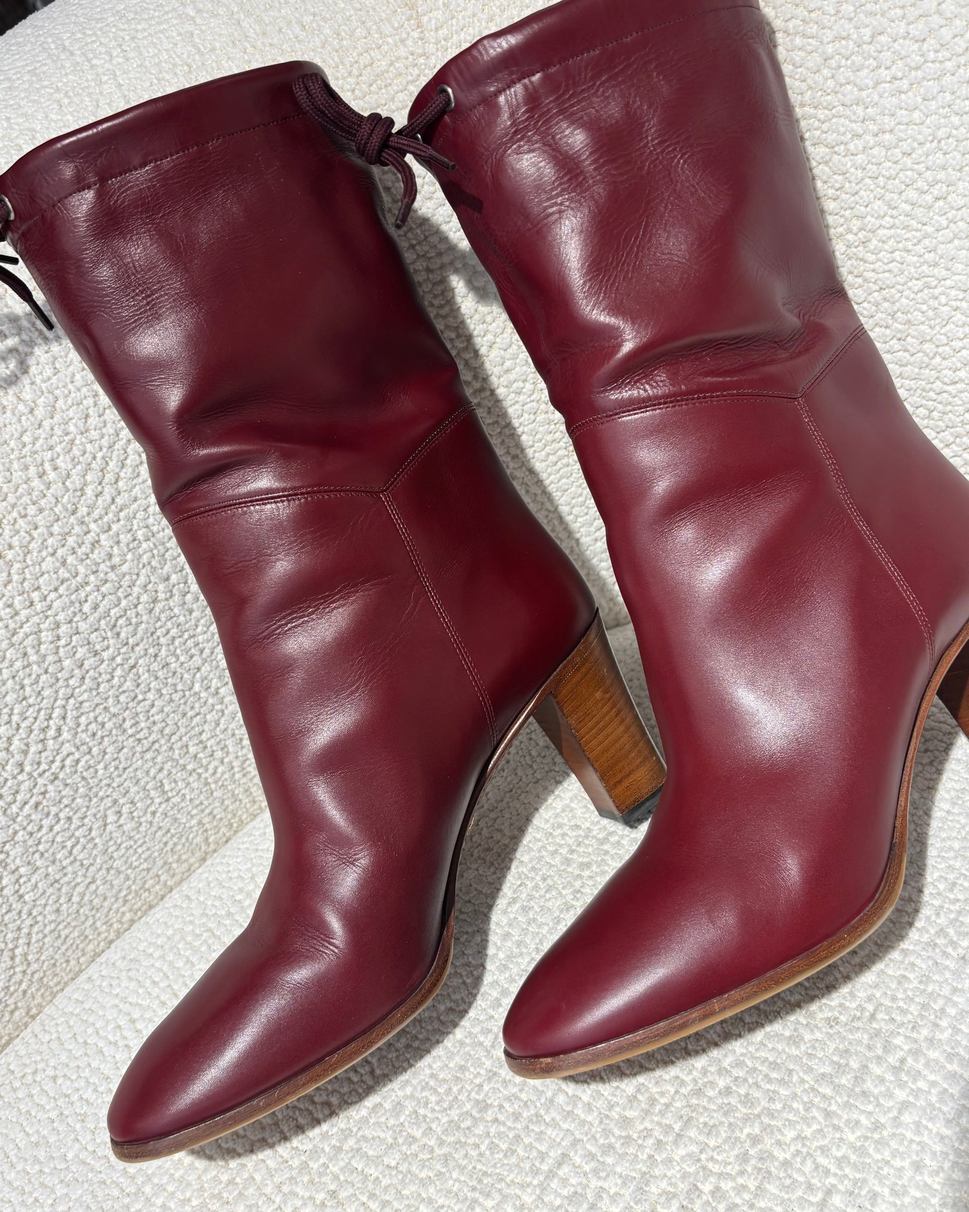 Absolutely stunning Gucci boots crafted in the softest, richest red/bordeaux leather, with a luxurious white monogram lining that can be folded down for a classic look or worn up for a taller, more discreet style. Incredibly comfortable and lightweight — no tightness, no heaviness.