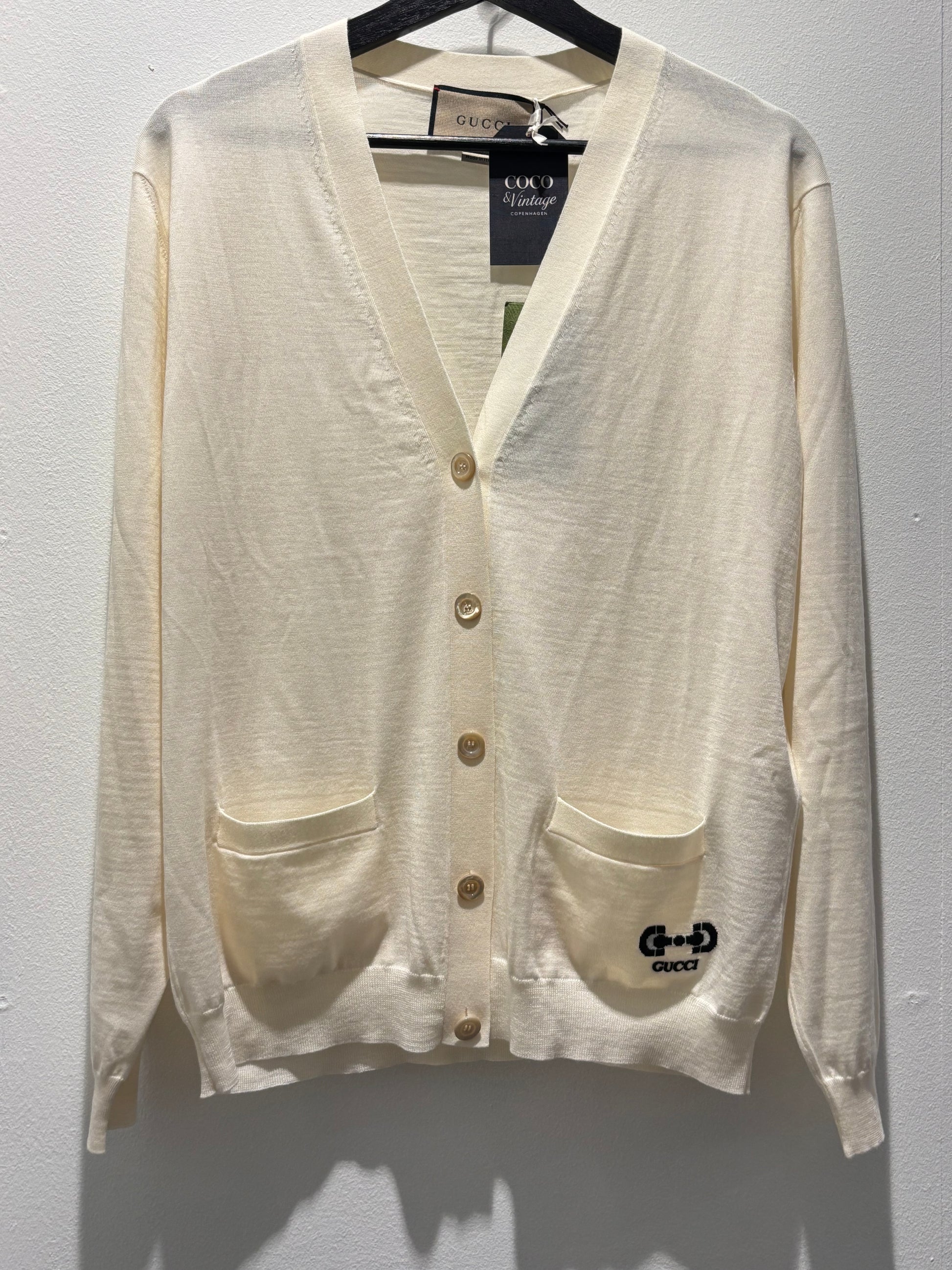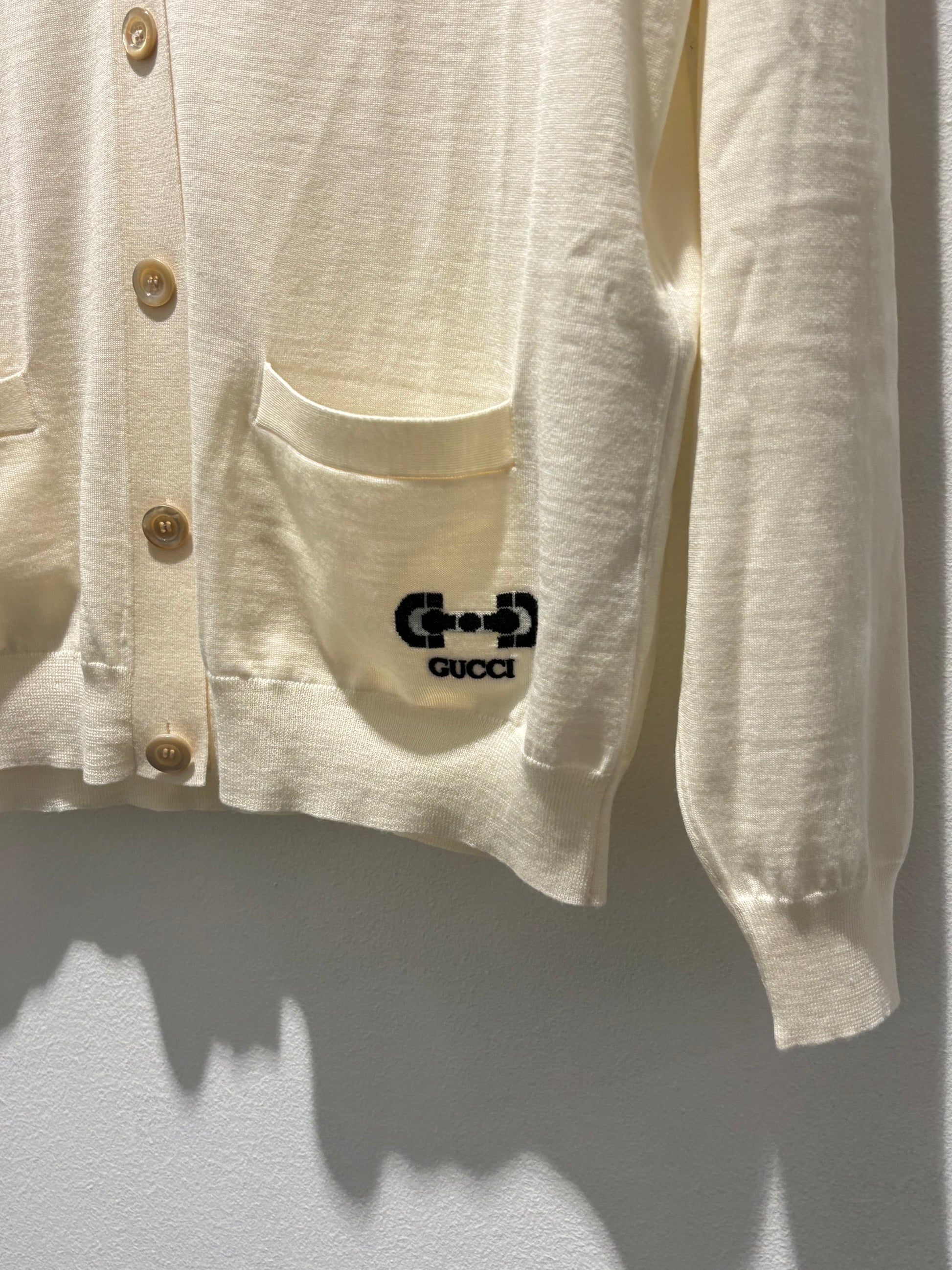 A refined and elegant cardigan from one of Gucci’s newer collections — a design that is both timeless and increasingly hard to find. Made from a soft, lightweight wool blend, perfect for year-round wear: airy and comfortable on warmer days, yet warm enough for cooler evenings. The beautiful ivory/White tone gives a classic and versatile expression, while the signature embroidered Gucci logo on the pocket and the discreet horsebit detail along the hem add a touch of iconic sophistication.
