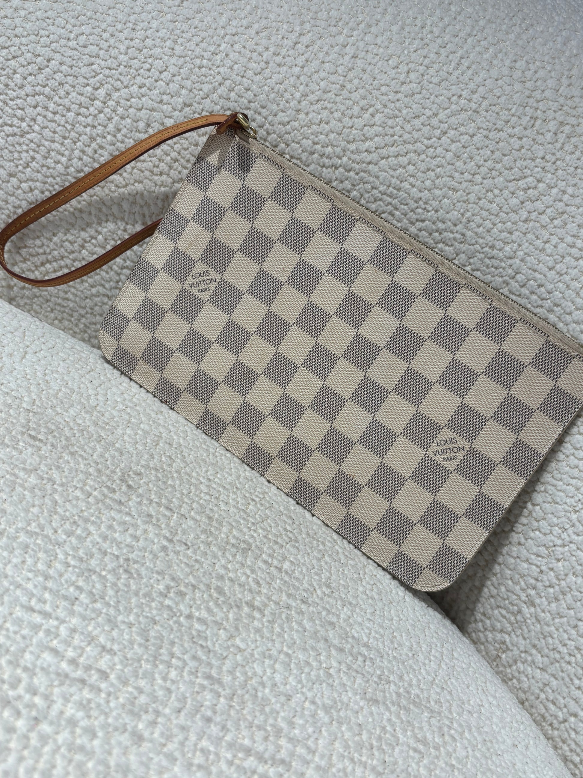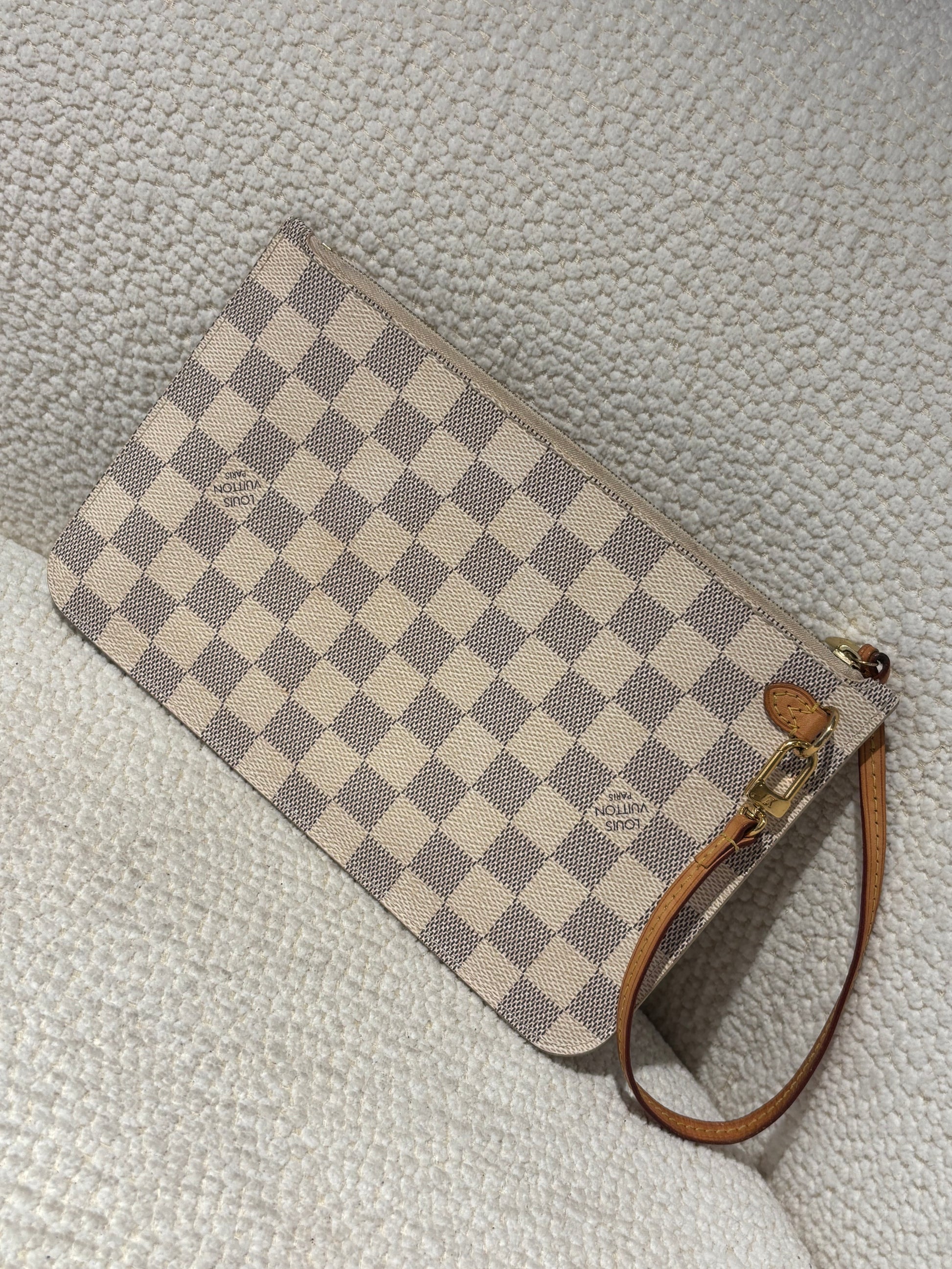 A beautiful Louis Vuitton clutch in the iconic Damier Azur print, finished with elegant gold-tone hardware and a top zip closure. Clean, timeless and effortlessly chic — a true LV classic.
