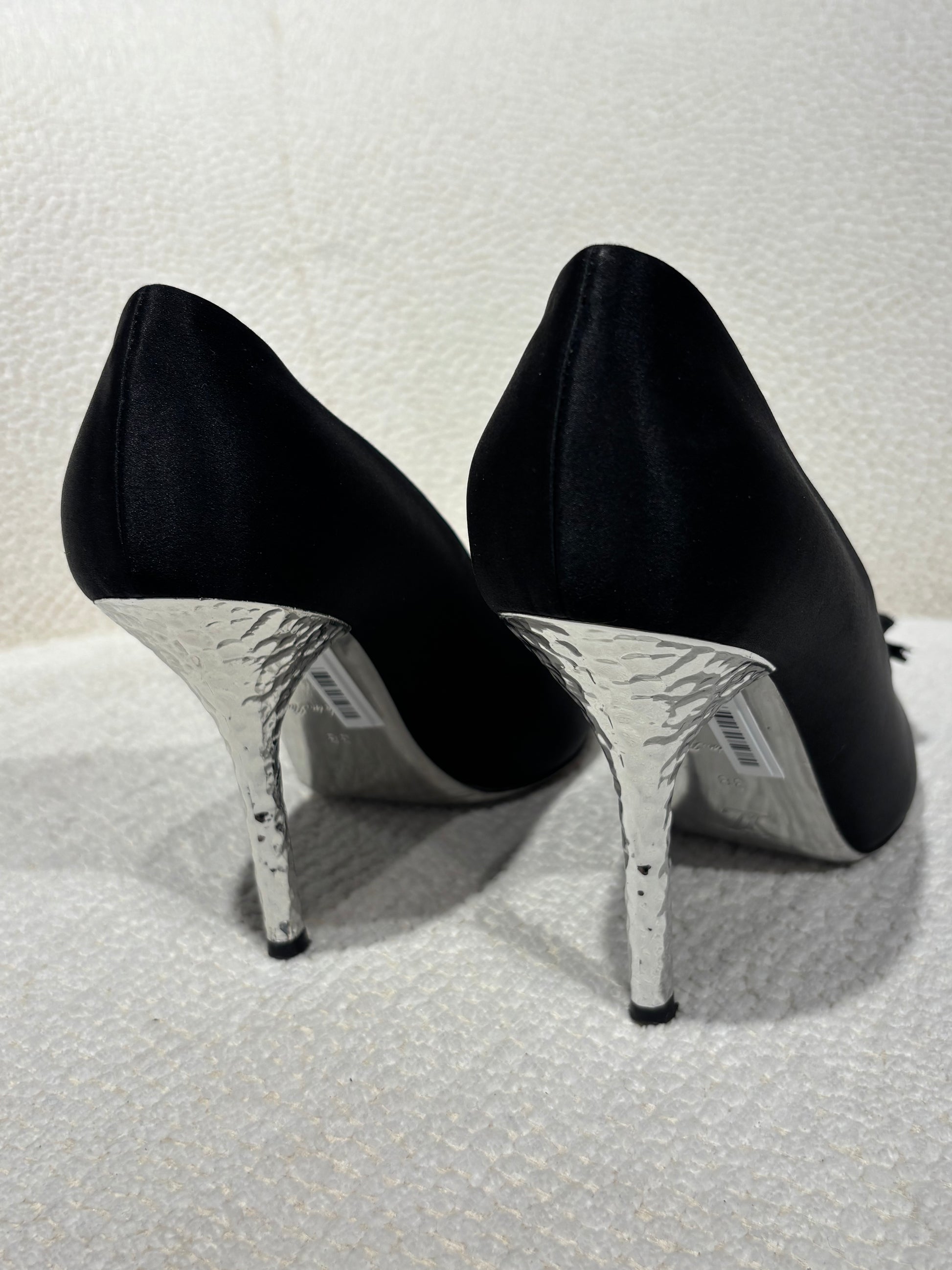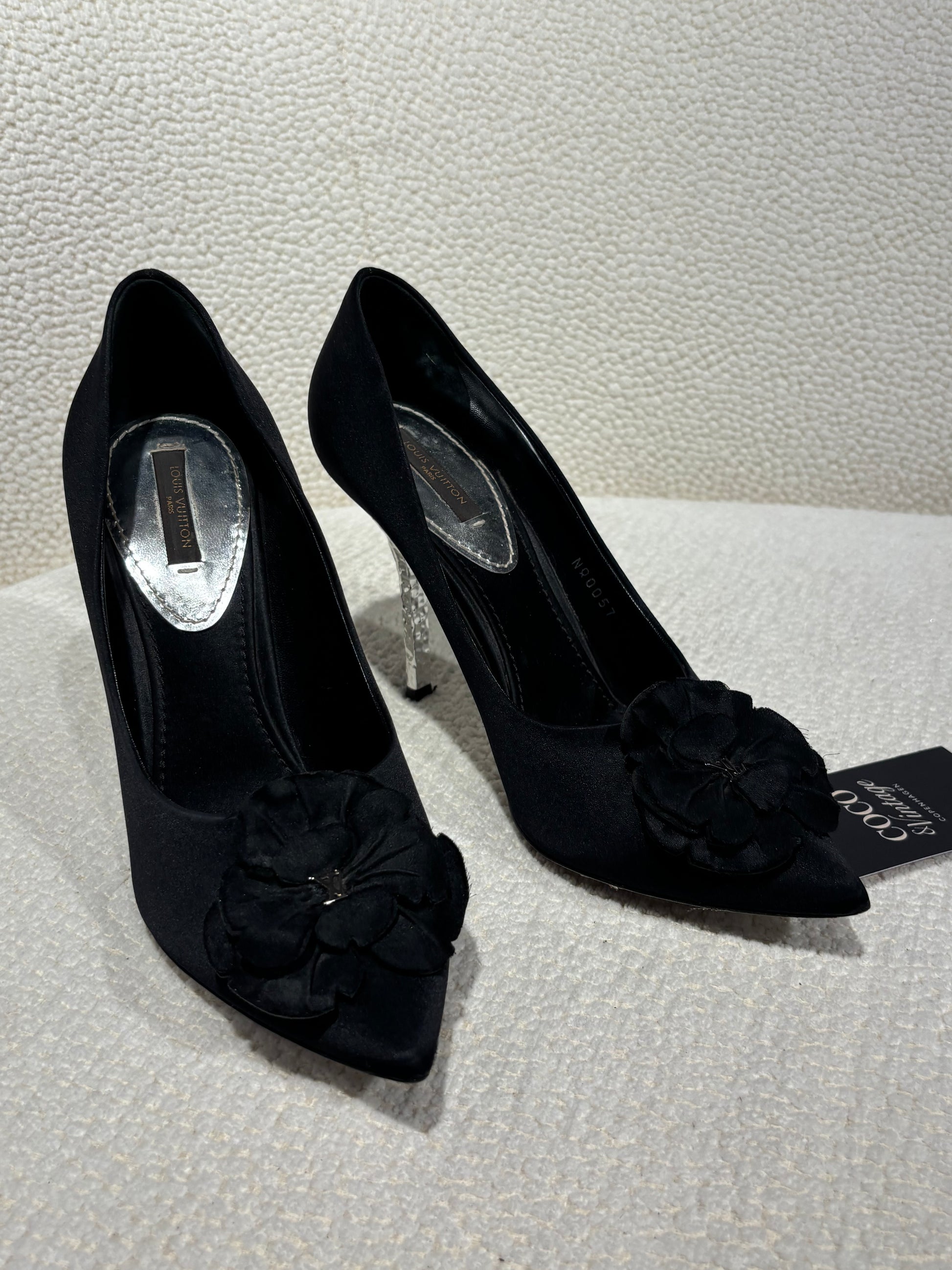 Absolutely rare and stunning Louis Vuitton stilettos, crafted entirely in luxurious satin with a gracefully turned silver heel. The pointed toe features a delicate satin flower and a silver LV logo, adding a refined and feminine touch. These incredible shoes are versatile, easy to style, and can effortlessly transform any outfit. A timeless classic and true eye-catcher — the perfect statement pair for any occasion.