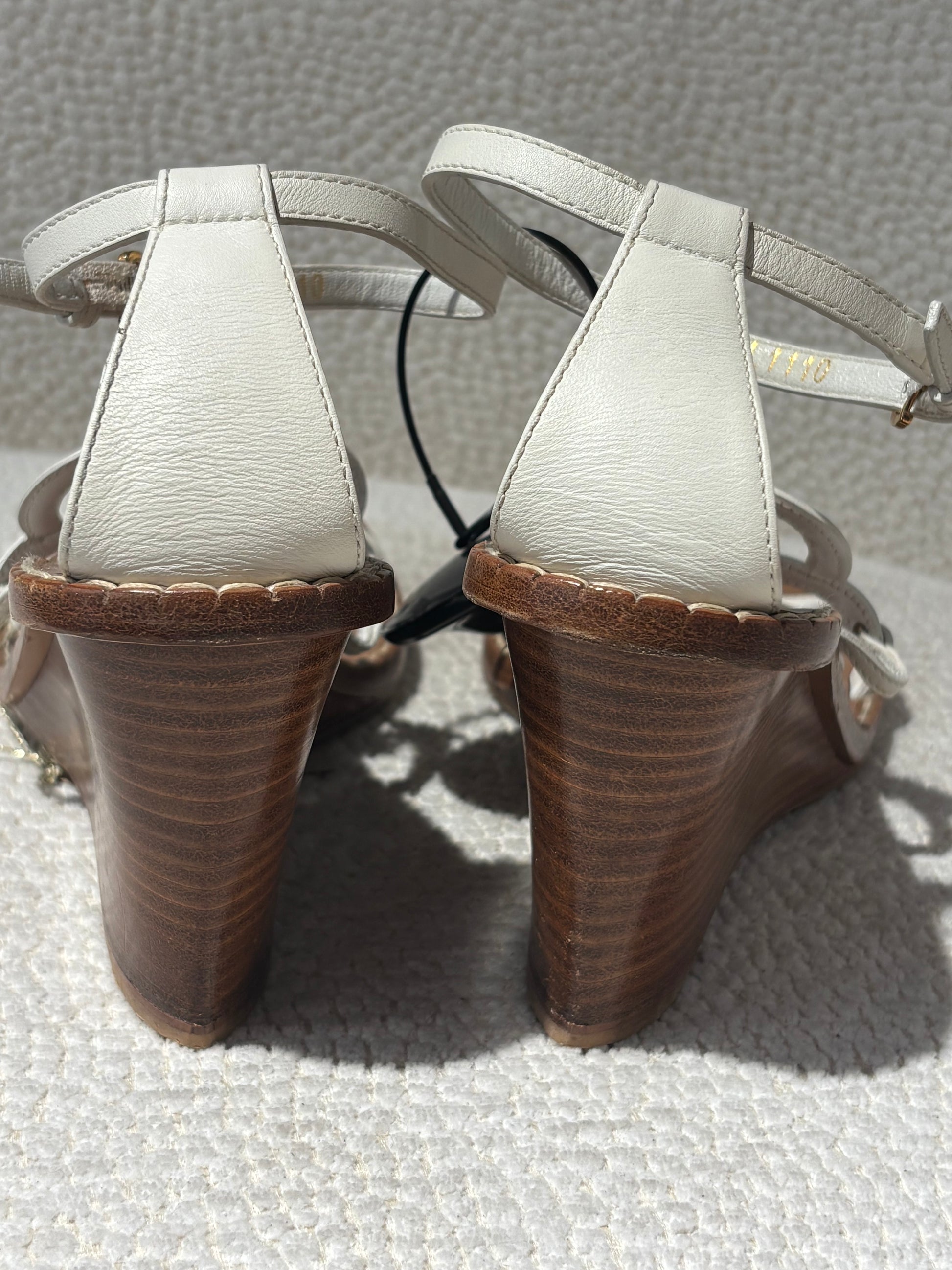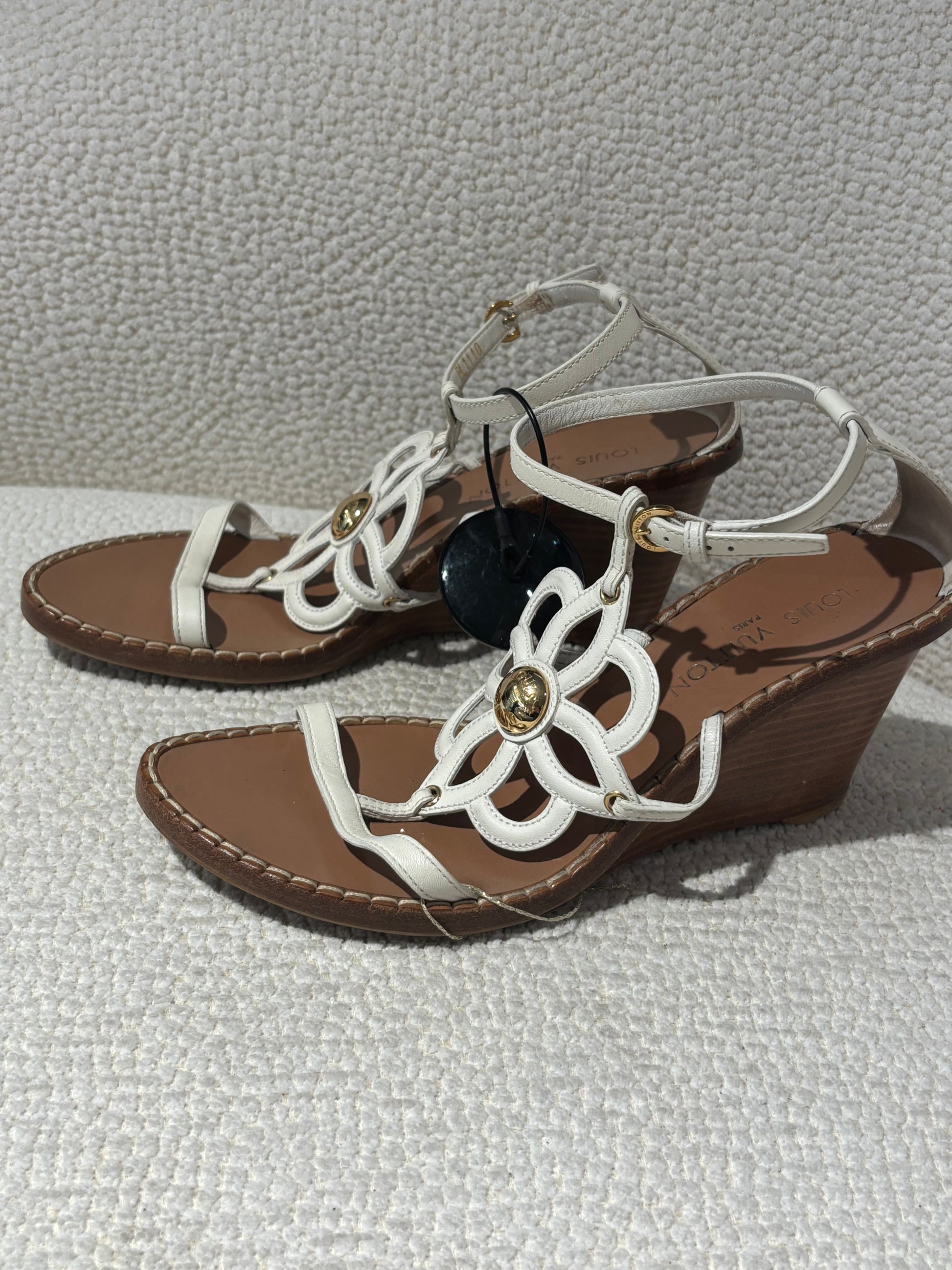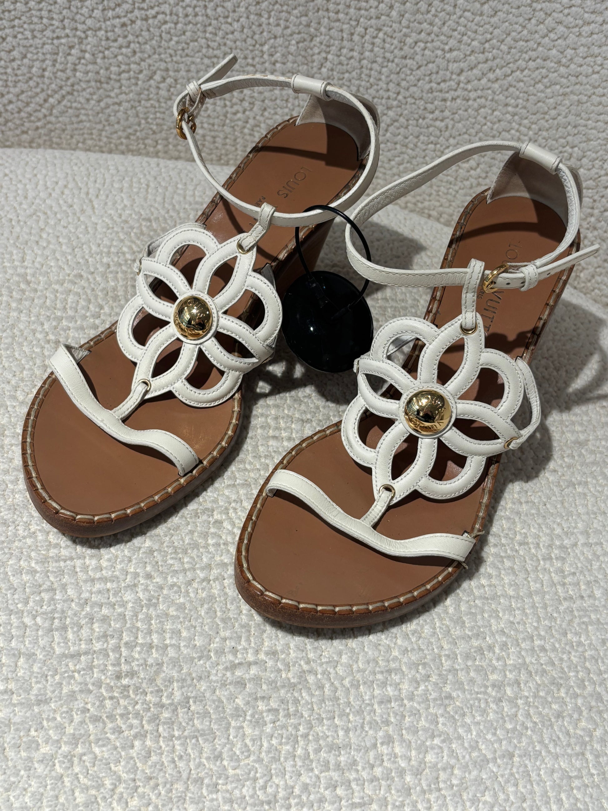 Louis Vuitton Wedge Sandals – White Leather with Flower Detail