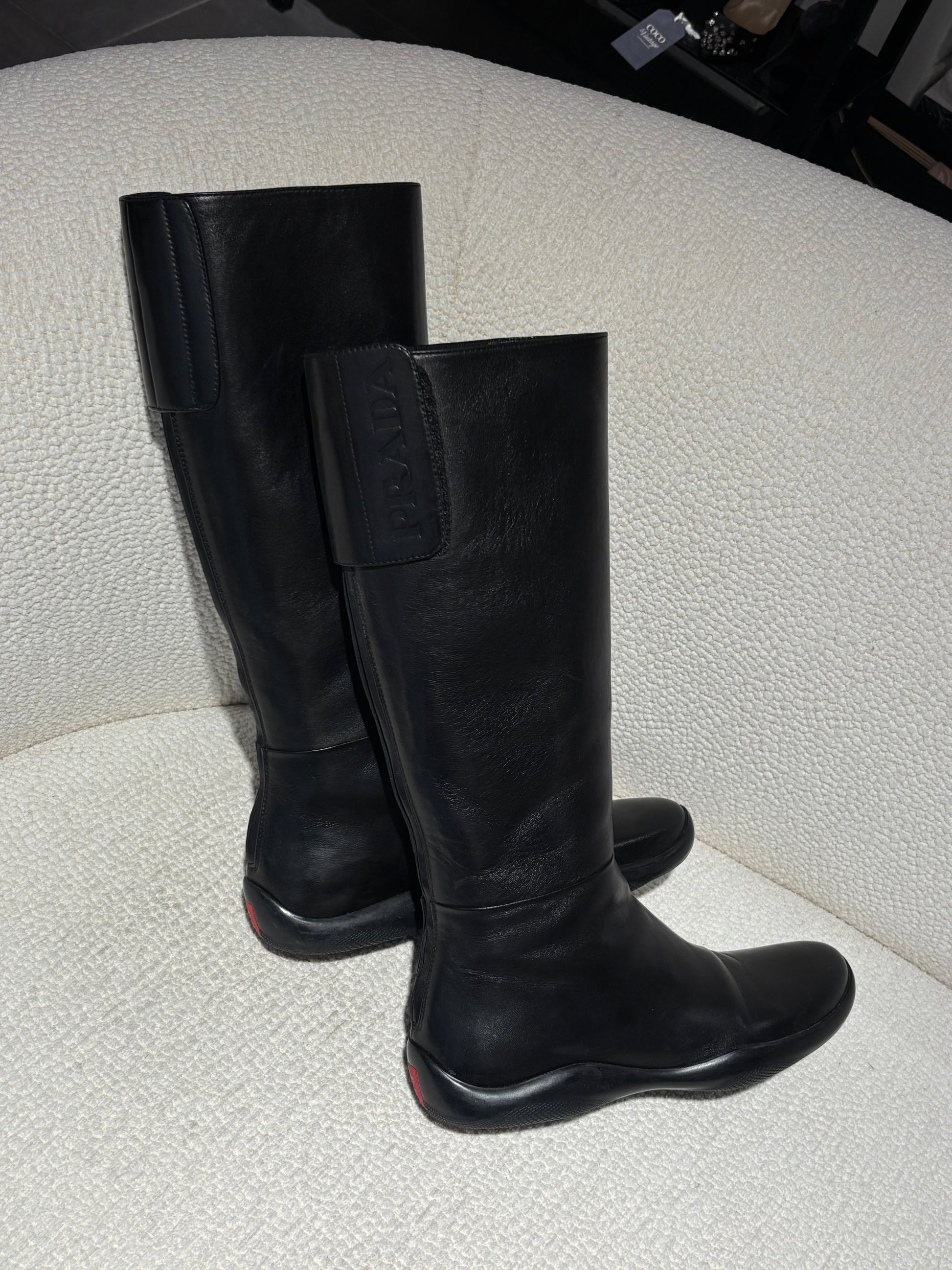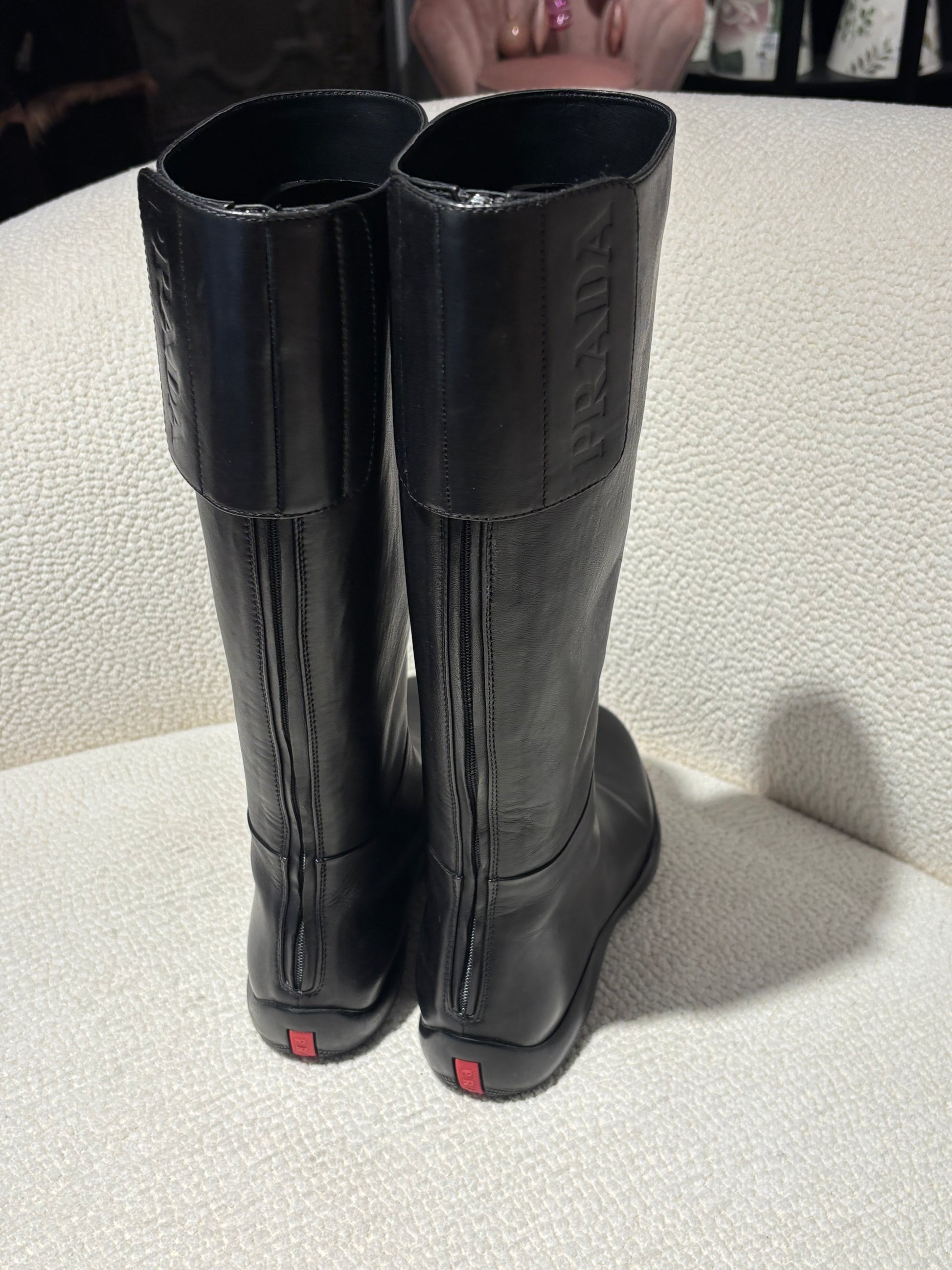 Prada Knee-High Boots - Black Leather & Embossed Logo - EU 39.5