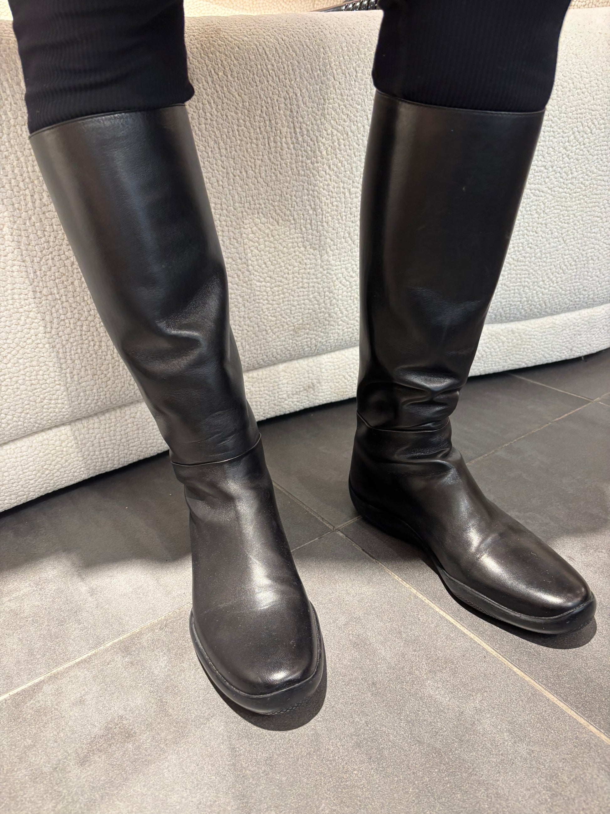 Beautiful Prada leather boots featuring the iconic Prada branding subtly embossed into the top flap. Finished with the classic red stripe detailing along the sole — a signature element from the house of Prada. A sleek, timeless and versatile pair that elevates any wardrobe while being incredibly comfortable!