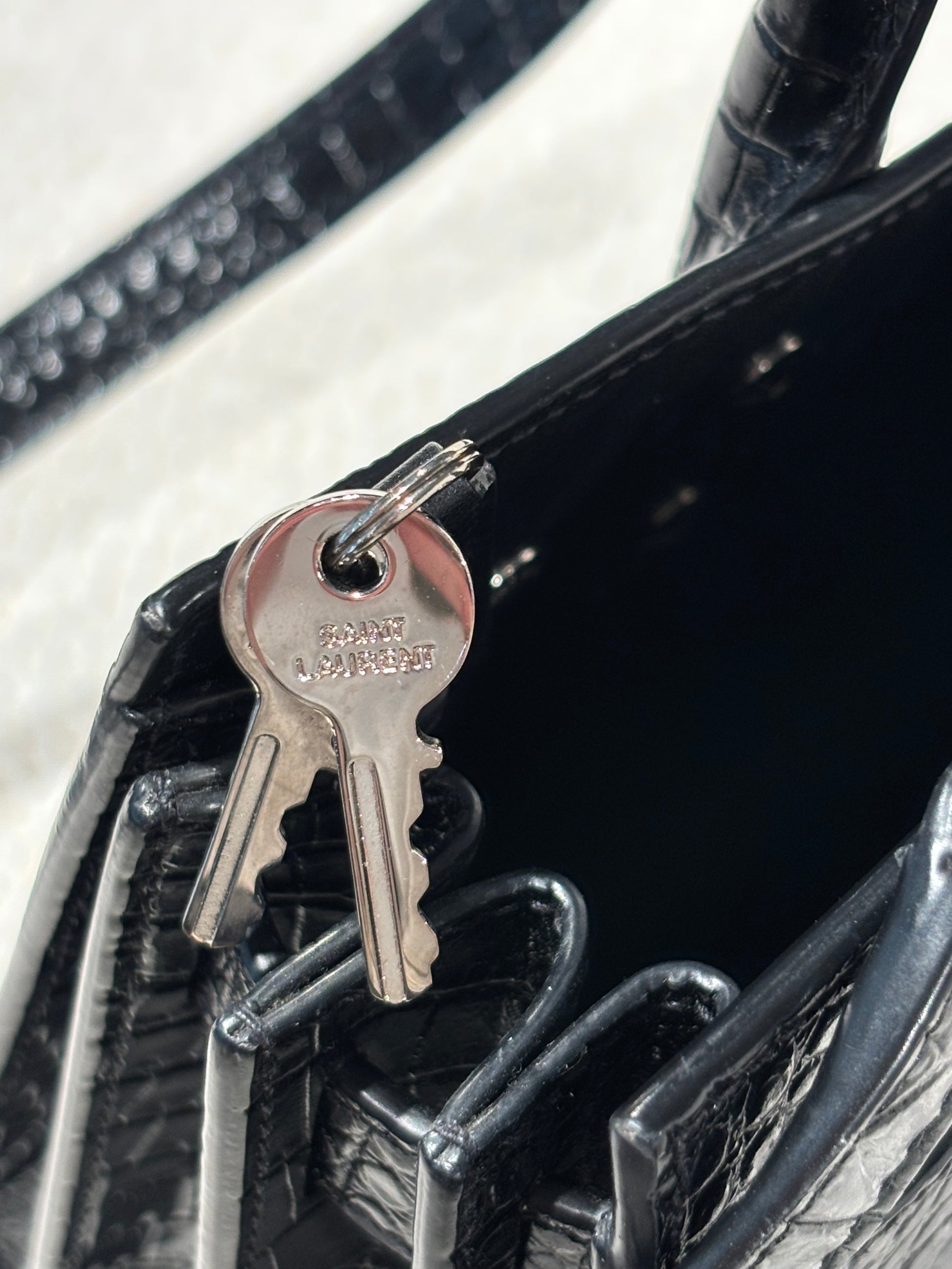 A timeless and refined Saint Laurent bag in beautiful alligator-embossed leather — elegantly highlighted by the iconic YSL logo and a delicate padlock with matching key as a decorative charm. The padlock can be discreetly tucked away, allowing you to adjust the look to your style and mood.