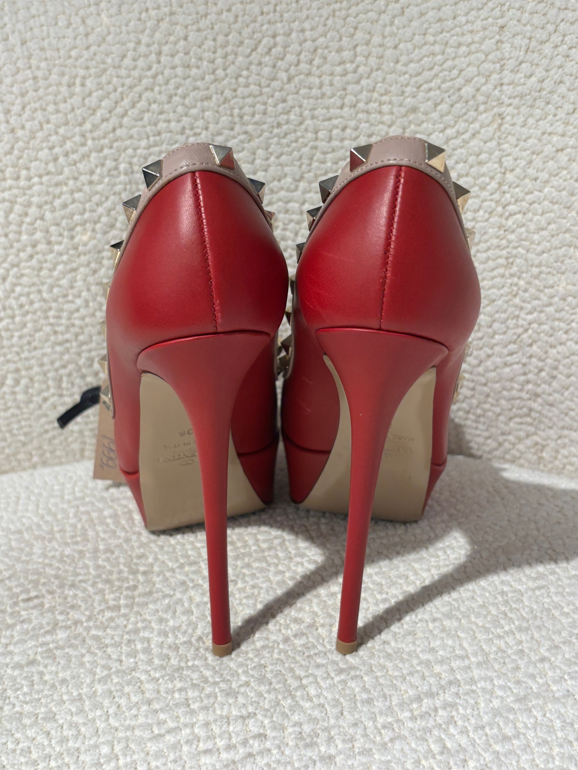 Absolutely stunning Valentino platform heels in red leather with pink trim and iconic stud details. A true statement pair — perfect for parties, events, or whenever you want to elevate your look. The high platform and heel create an elegant silhouette while still offering comfort and stability.