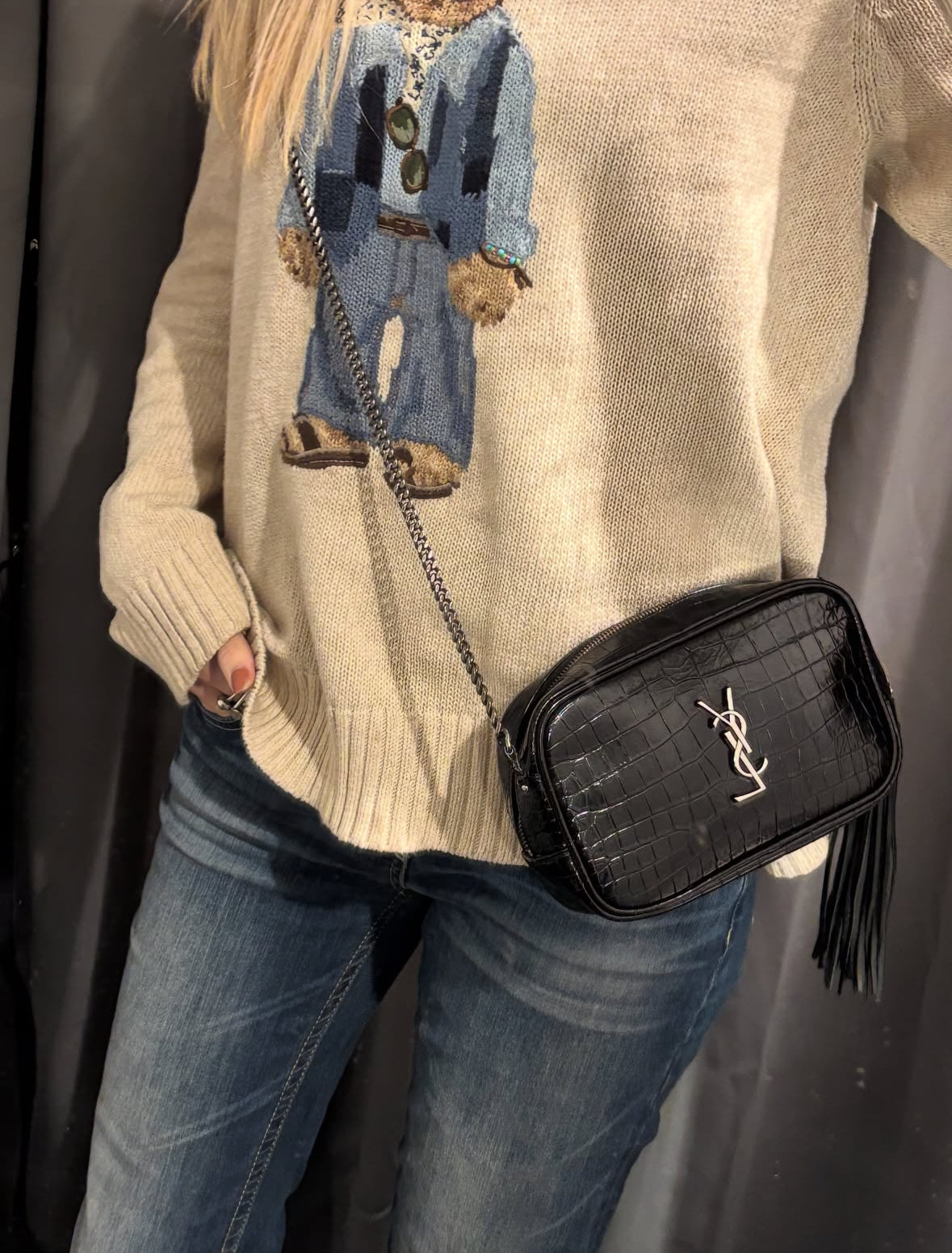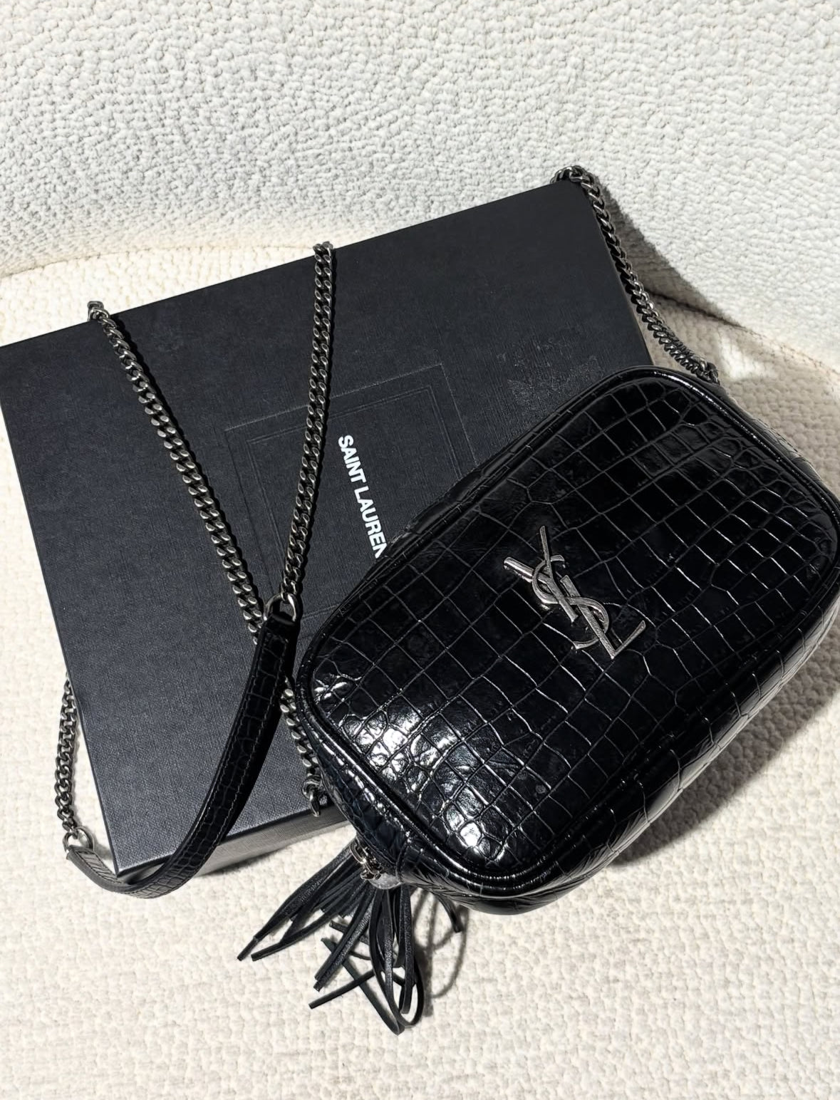 The most beautiful Saint Laurent crossbody bag crafted in glossy crocodile-embossed leather with a luxurious shine. A timeless and sophisticated piece featuring the iconic silver YSL logo and a delicate leather tassel.